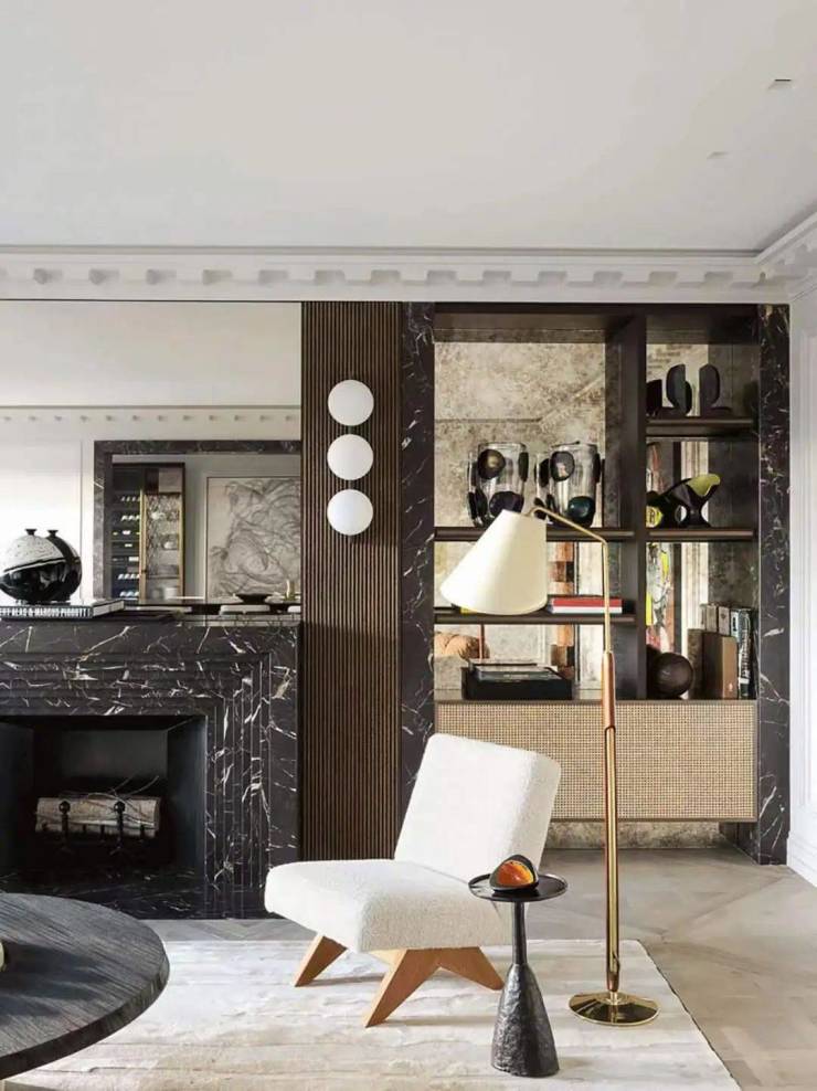 餐客厅尺度达到了惊人的 16米,97m²,用一席壁炉做了视线分离,米色的洞石、自然冰裂纹的艺术漆。背景墙拱形胡桃木的静谧,地板拼花木格纹的精细,沙发钢琴键织布的韵律,营造的是回归生活本质的轻松写意。