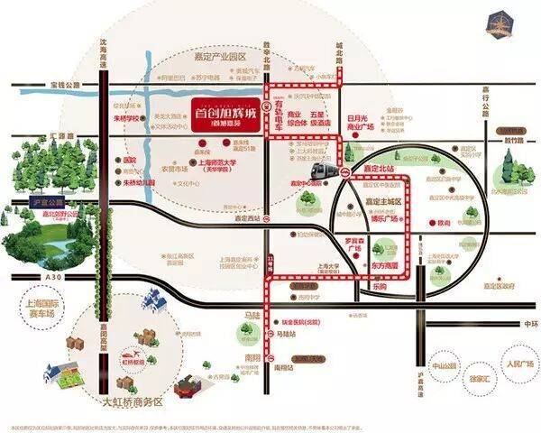 首创旭辉城位于嘉定高新产业园区内的核心位置——汇源路胜辛北路, 距离11号线嘉定北站约4.5公里 ,小区门口有嘉朱线和嘉定51路两辆地铁直达公交。自驾的话,周边有 沪嘉高速、A30绕城高速、沈海高速三大高速环绕 、形成了便捷的立体交通。