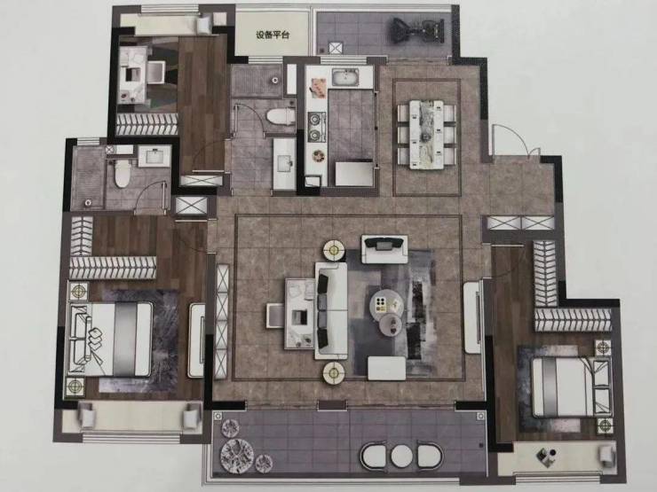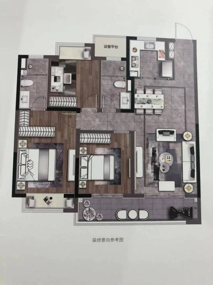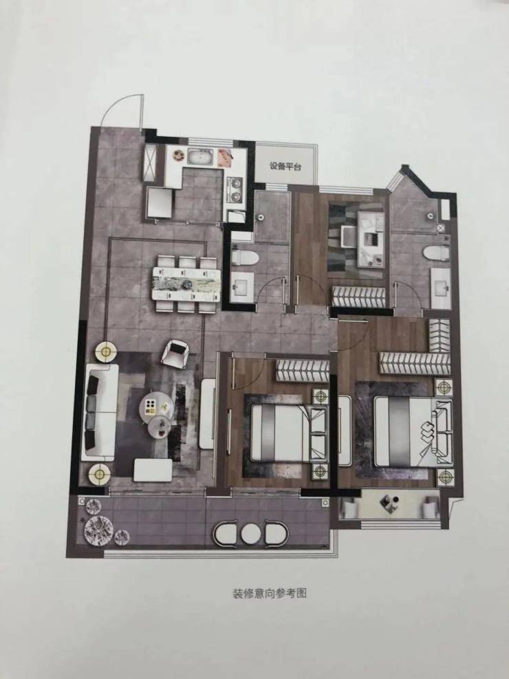 116㎡的户型为三房两厅两卫,阳光三房,动静分区,主卧次卧南北飘窗,阳光入室,俯仰清风,套房主卧,提高舒适度、私密性。