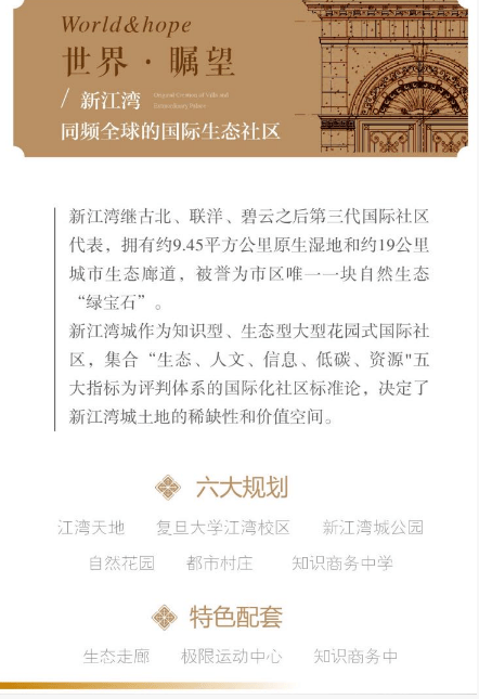超配的第三代国际社区:2010年,结合世博会背景契机,新江湾因契合“生态、人文、信息、低碳、资源”国际社区标准论,成为继古北、联洋、碧云之后公认的第三代国际社区。