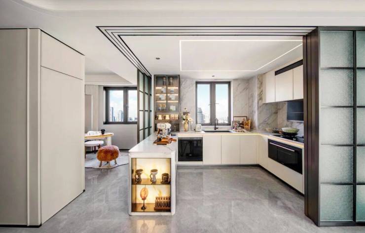 公共空间以厨房折叠门、岛台的嵌入,实现无墙化处理。餐客厅、厨房及北向书房通过大落地窗、以及客厅为中心的南北透光带打通,真正意义上实现了功能又能分而不离、约270°采光、无遮挡的空间体验。