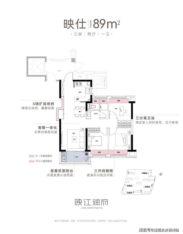- **89㎡三房**:不足90㎡实现全功能三房,三开间朝南,270°转角飘窗赠送,搭配六大收纳系统(玄关、餐厨、卫浴等),创新“S墙”设计释放厨房空间,三分离卫生间提升实用性。