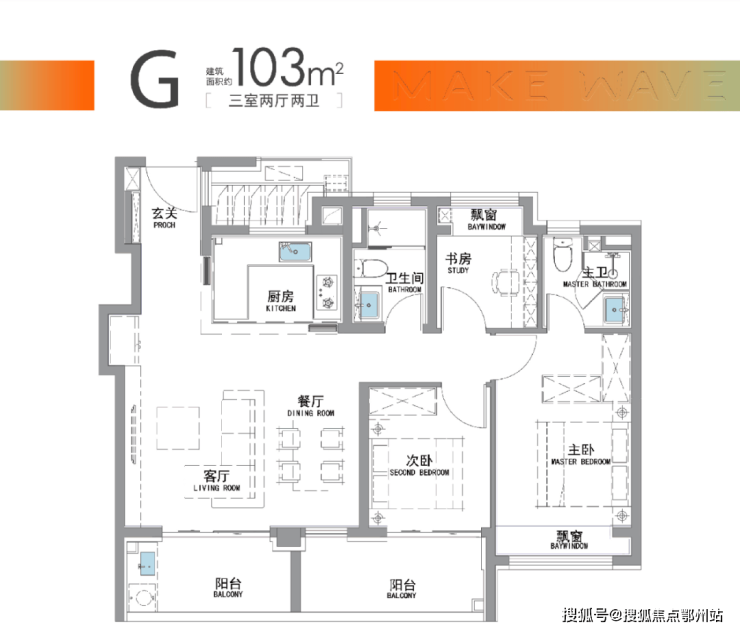 建面约103户型,南向超大面宽+双阳台,品质三房的不二之选!