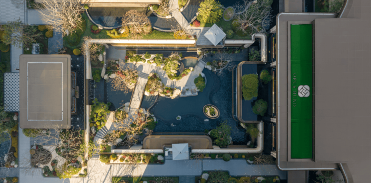 项目以“水脉串联,院落共生”为理念,规划将这样蜿蜒流动的水系有机延伸,串联起各楼座单元,让每一位居者都能实现“伴水归家,步步亲水”的生活场景。