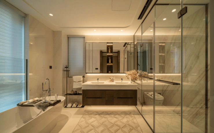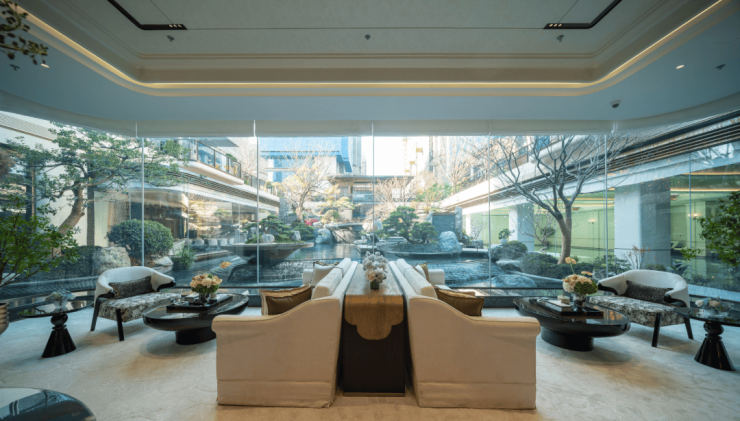 CCD操刀的“摩登东方”美学在此得以完美演绎,高端石材、精致的金属线条与温润的木饰面在自然光影下交织出丰富的质感层次。