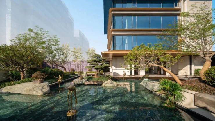 一棵9米高的特选乌桕,与红果冬青、紫薇、进口造型羽毛枫等名贵花木,勾勒出郁郁葱葱的林冠线。沿着园路漫步,可触摸到现场切割拼接的弧形“富贵绿”景石,也可在景观飞桥,对望约3.5米高范思哲黑石材的跌水幕帘。
