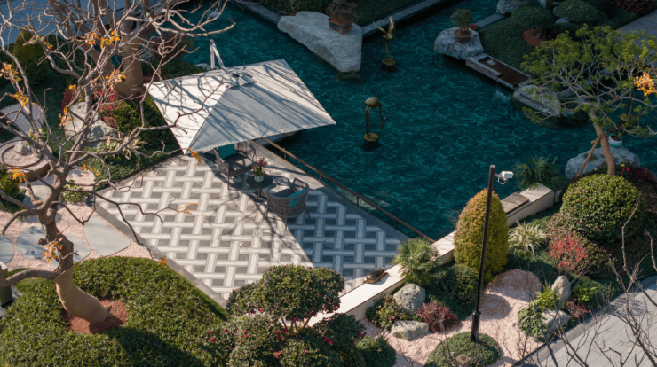 蜿蜒的曲线水景如同流动的玉带,池底的普拉达绿石材,让水体呈现出深邃的碧色。