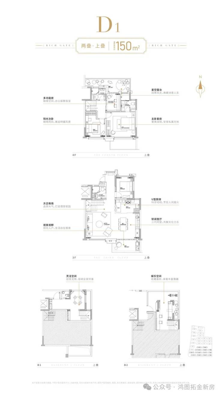 空间革命:建面约150-158㎡两叠产品,创新采用「上叠+下叠」四层设计,每户标配双层地下室+南北花园/露台,下叠享南向庭院,上拥星空露台,实现联排级空间体验;