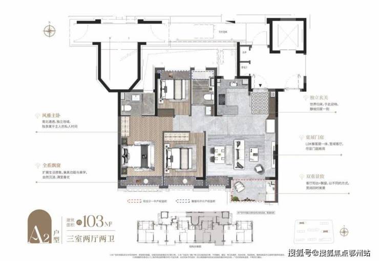 项目建面约103㎡3房同样是 三开间+大横厅的布局,但尺度上更进一步。而且灵动空间更多, 全屋飘窗+南向观景阳台,提升性价比的同时也增强户型对外的延展性。