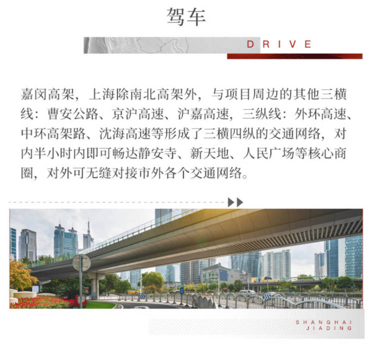 自驾:嘉闵高架,上海除南北高架外唯一的南北大动脉,与项目周边的其他三横线:曹安公路、京沪高速、沪嘉高速,三纵线:嘉闵高架路、外环高速、