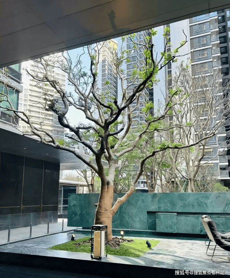 这场旅程始于园区入口——两棵超50年树龄的全冠罗汉松,以苍劲姿态守护家宅祥瑞;穿过蕴含正能量寓意的白水晶照壁,步入酒店式迎宾前厅,一株硕果累累的古桩孤植铁冬青,静候家人归来;信步而至的镜面水院,六棵凤凰木阵列水中,取意「有凤来仪,筑巢引栖」;此后,再经由作为社区客厅的悦仕会所与绿意盎然的中央园林,最终抵达静谧尊崇的楼栋大堂,完成一场从「城市菁英」到「家庭主人」的身份与心境转换。