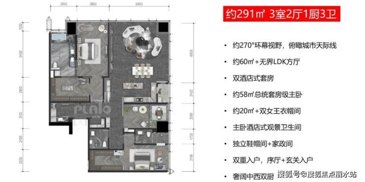 约60-80㎡无界LDK方厅丨约58-60㎡总统套房级主卧丨约20-25㎡超女王大衣帽间