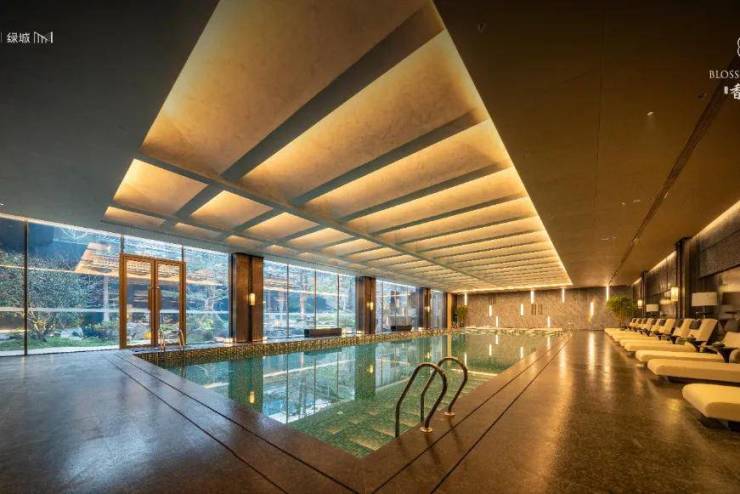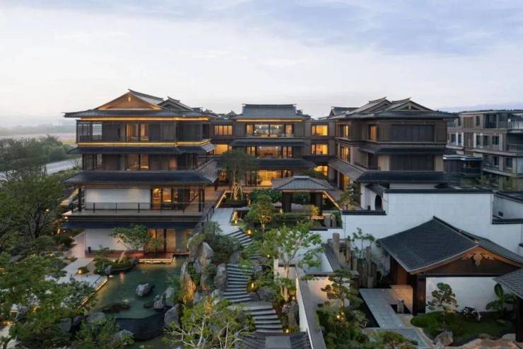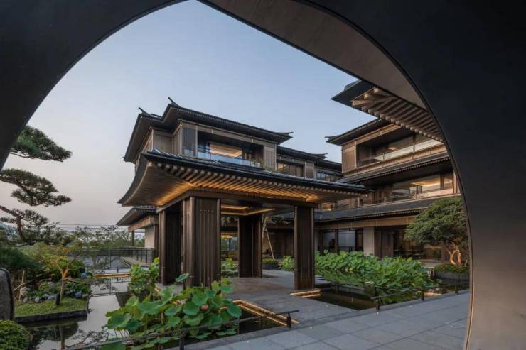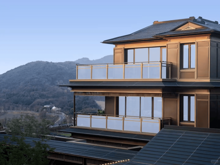 建筑立面:古今交融的诗意表达:外立面以香槟金铝板 为基调,搭配 蓝眼睛石材 与玻璃幕墙,融合传统歇山重檐、纳福悬鱼等元素,既保留宋式建筑的对称美学,又赋予现代建筑的轻盈通透。合院组团采用 三面庭院设计 ,L型景观面与环绕式檐廊,将超山梅影、丁山湖光引入每一扇窗景!