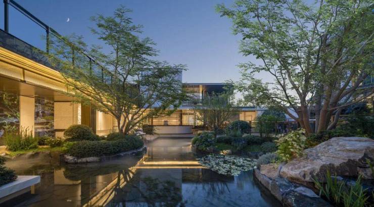 漫步于光影交织的幽静庭院,您将踏入一方充满诗意的天地。潺潺流水映照着婆娑树影,挺拔树姿为这片空间注入向上的生机,纵向延伸出无限的视觉张力。这座下沉庭院,不仅拉近了建筑与自然的情感共鸣,更使室内与景观紧密相连、和谐相融。每一扇窗户,都犹如框中的一幅生动山水画。