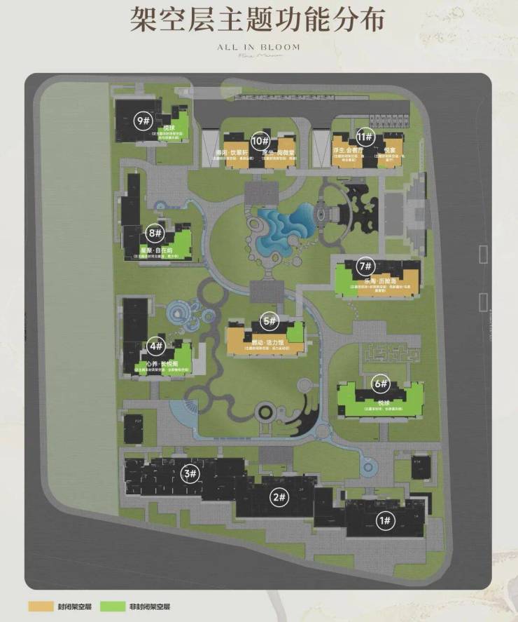 景观设计风格与建筑相统一,整区打造“合悦绽放,漫岛芳华”的主题概念,享艺术、微度假、秀生活的景观,从细节出发匠心打造隐奢美学界面。景观灵感源自著名珠宝品牌CHAUMET,以“繁花造型珠宝”为设计理念,将大胆、华丽、创新于景观之中,形成特有的珠宝风格景观设计系统。景观整体采用“一轴、一带、两芯、八境”,兼顾生活美学与宜居体验感的,并通过层层递进的空间迭加形成移步换景的作用,最大限度的提升居住感受。