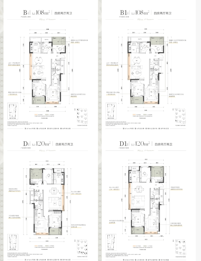 更大一些的户型如建面约 108㎡、120m²的四房边套设计,不仅面积宽敞,且南北通透,南向双卧室+客厅大飘窗的设计也提升了居住舒适度。