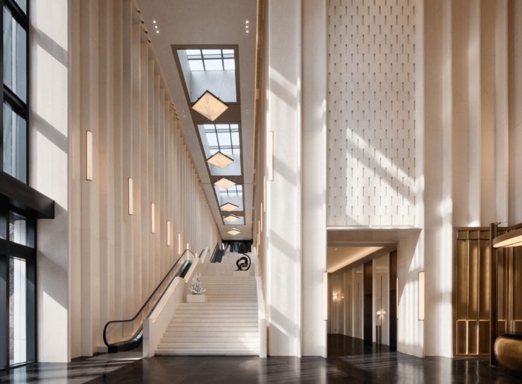 豪宅中,会所+泳池已成为市场标配,但是中兴傲舍却将之与艺术融合,把艺术变成了生活的一部分。14.5米超高挑空的归家大堂,搭配三大园景礼序和七重风雨连廊,从进门就仪式感爆棚。