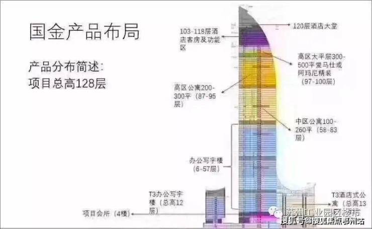 苏州IFS主塔楼地下5层,地上128层,高达450米,是全球超高层可售住宅第二高、江苏省第一高楼、2600年苏州至高点。其荟萃“湖畔平层”酒店式公寓、“云顶无界墅居”空中别墅、顶级天际奢华酒店NICCOLO、“旗舰办公”甲级写字楼等一系列国际水准的前沿物业,邀请全球塔尖人士、财智精英、品味先锋一道,我来,我见,我征服。