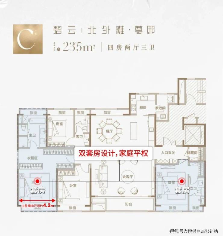 建面约235㎡户型更是做到 南北通透+四开间朝南+南向大宽厅的格局,让业主起居之间沐浴充足阳光。