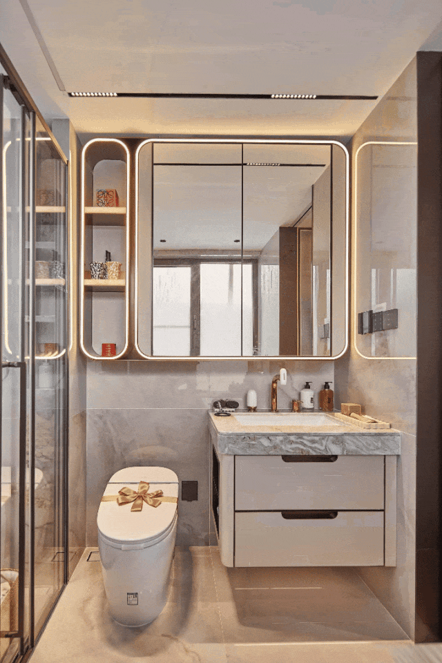 尺度的越级: 四开间朝南,客厅大面宽,相当于 “把别人家的客厅搬进了自己家”。独立玄关形成 “入户缓冲区”,避免开门见厅的尴尬;双套房设计,主卧套间配备独立卫浴,卫浴空间引入 “双台盆 + 浴缸 + 淋浴” 的三段式设计,堪比五星级酒店套房。
