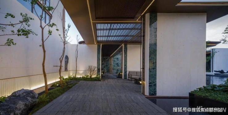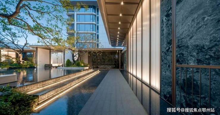 穿过归家大堂,入眼的便是大片的镜面摩登水院,涌泉叠水,高低错落、动静相宜。 景观 设计团队更是在水院里做了一个下沉式卡座,未来业主可以在这里闲坐观景,与三五好友可以畅聊天地。
