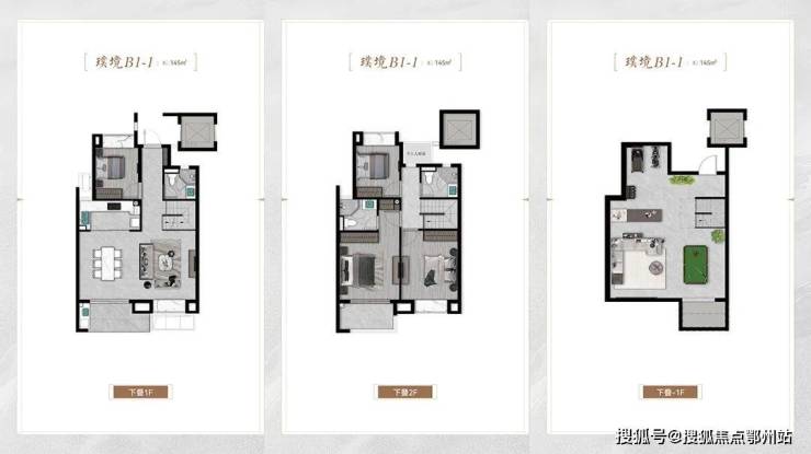 建面约125-145平的叠墅主打空间感,下叠通过南向庭院直接入户,一层客餐厅一体化, 南向采光比较充足,二层居住区套内无承重墙柱+少梁化设计,业主自由发挥空间大, 地下空间层高约5.2米,并设置采光窗非常实用。