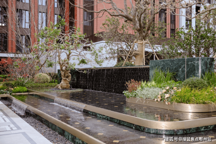 水畔之汀:作为未来主入口迎客水景,延续海派弧形收边设计与叠水效果,幻影蓝流水墙、普拉达绿景墙与奢金影灯撞色融合,中央百年桩景红果冬青与进口红枫搭配,成为点睛之笔。