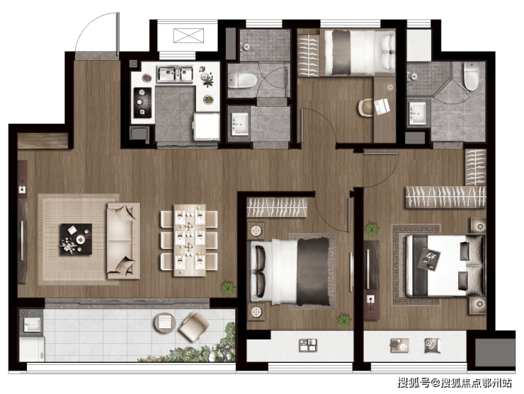 南向3.5面宽,在105㎡面积段做南向餐客横厅并连通景观阳台,是该户型加分项。公卫三段式卫浴设计,干湿分离;双卧朝南带飘窗,主卧套房