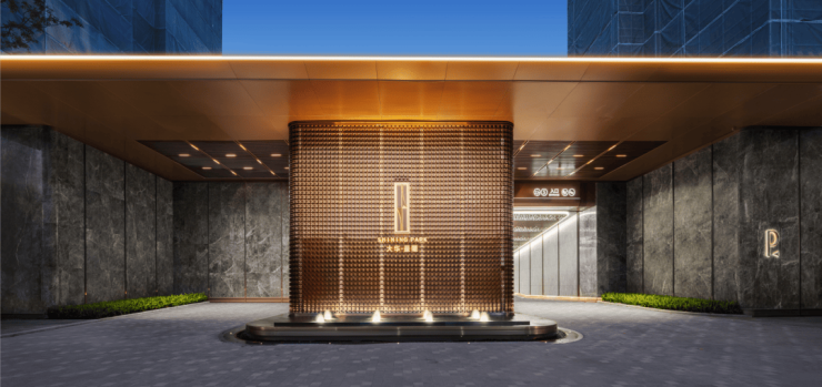 地上大堂,单元门厅的 雨棚采用香槟金的弧面铝板、立面干挂爱马仕灰蜂窝岩板, 岩板上嵌入专属楼栋号,单元门两侧的弧线段金属采用定制模具加工。