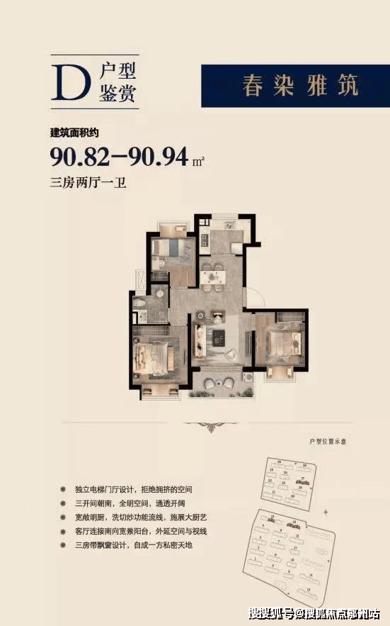 建面约90-94㎡3房2厅1卫▼