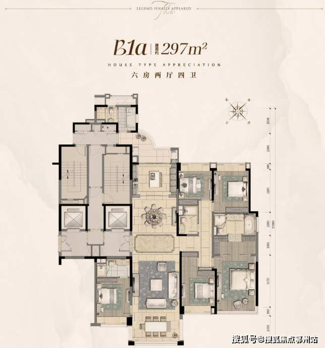 建面约275平,六房两厅四卫,与265平户型整体结构比较接近,多出10平米,多得一间房。
