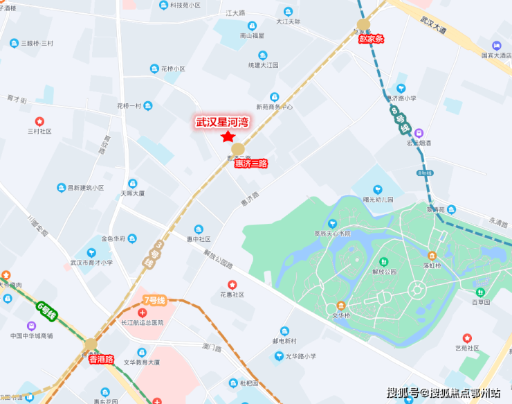 武汉星河湾位于建设大道与惠济二路的交汇处附近,门口就是地铁3号线惠济二路站,差不多在内环与二环正中间的位置。