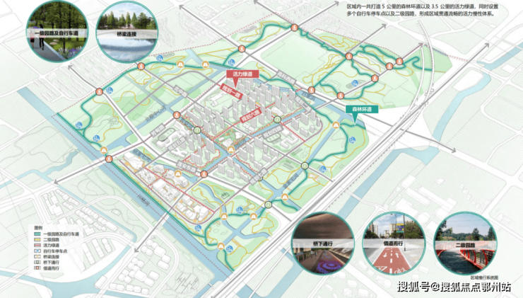 5公里森林环道以及3.5公里活力绿道,部分街区通过桥梁进行衔接,联系被市政道路割裂的绿地,使绿地成为一个整体,车流量大的城市道路交叉处慢行系统桥下通过。
