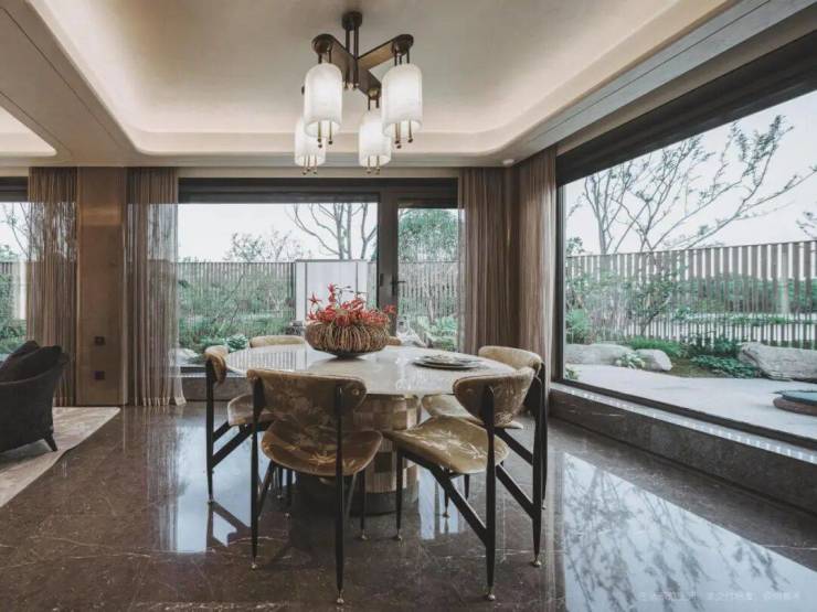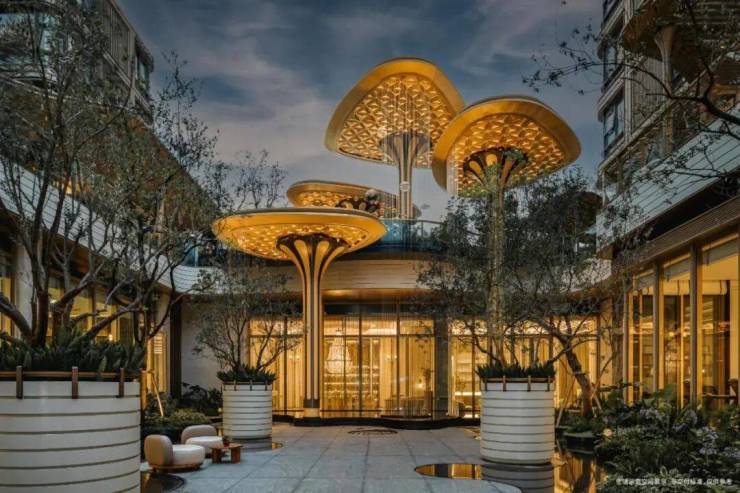 :全香槟金铝板外立面(对标汤臣一品)+ 窄框全景玻璃,历久弥新,海派宋式美学辨识度拉满。