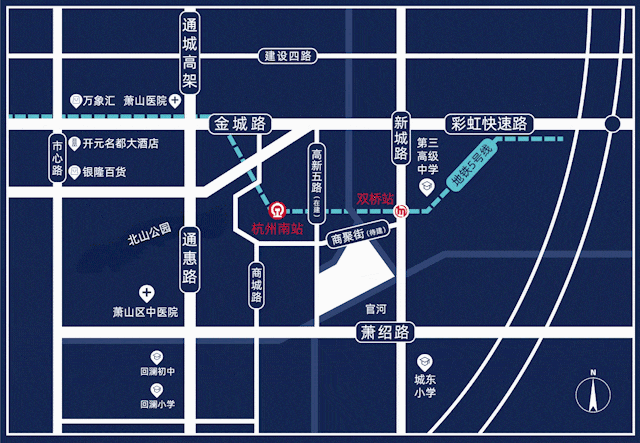 约1000米至金城路( 萧山主城核心轴线 ),约1500米至彩虹快速路( 2021年贯通,约15分钟车程直达滨江核心 ),约20米至萧绍东路(萧山绍兴双城主脉)。