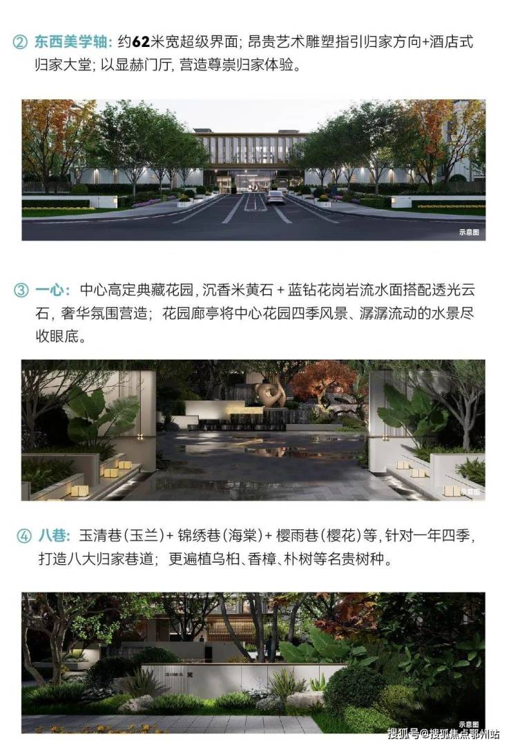 太湖朗墅以“一心·二轴·八巷”为基础,精筑五大未来生活美学体验空间。同时于社区打造 约52米、62米超级双门庭界面 ,以显赫门庭尺度,营造酒店式归家体验。