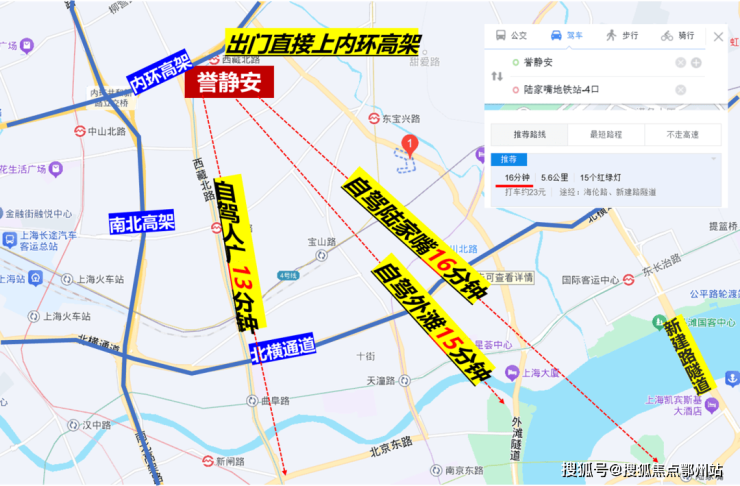 自驾也相当方便,项目出门即接入内环高架,直连南北高架、北横通道及延安路高架,可以便捷到达各个城市重要节点。从项目到陆家嘴、外滩和人民广场都在一刻钟左右(百度地图测量)。