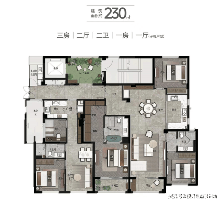 南北通透客餐厅,动静分离;230㎡六房二厅三卫,南向奢华五开间,罕见三套房设计;230㎡子母户型,三房二厅二卫+一房一厅一卫,南向奢华五开间,既要大家庭的其乐融融,又要小家化的私密空间。