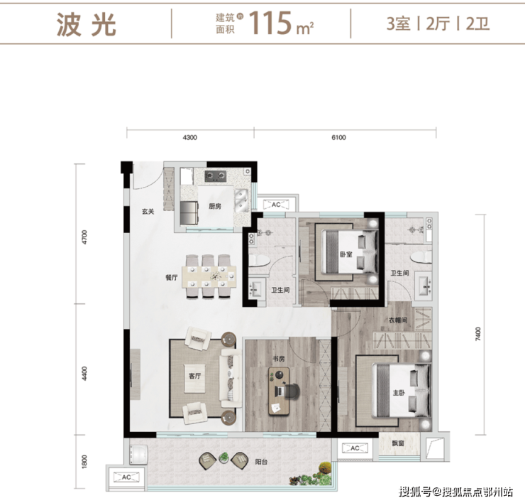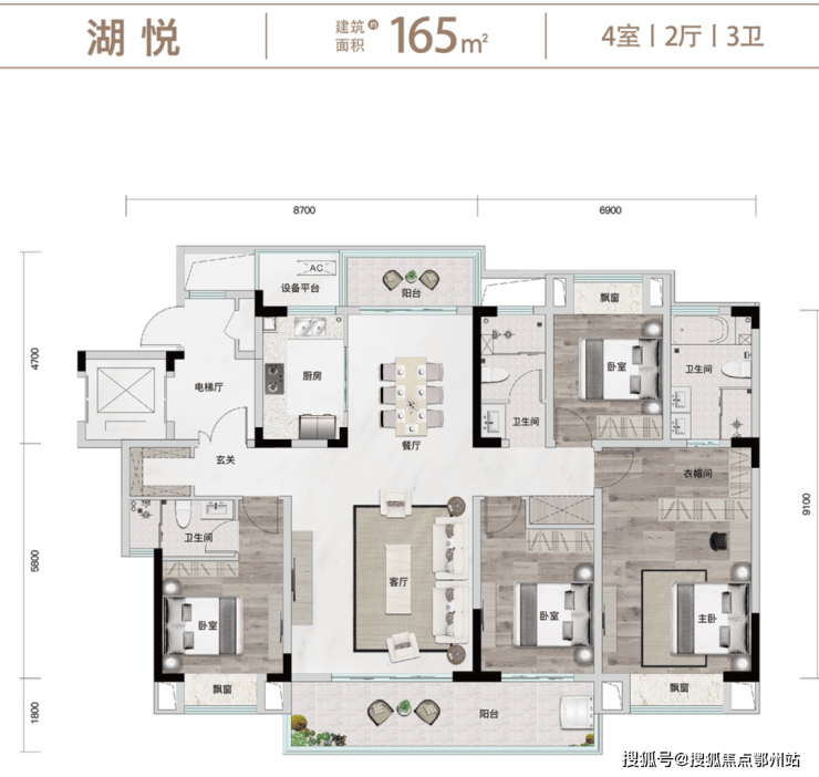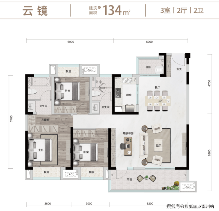 方正户型、动静分离,明厨明卫,超大景观阳台,主卧独立明卫、衣帽间