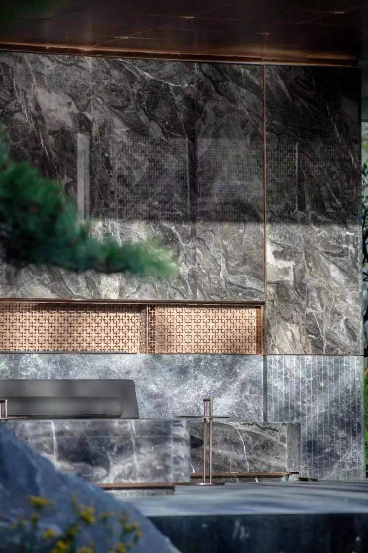 而大华星曜不仅打造了具有曲线美感的树池,还在水景底部铺了数百片蓝钻瓷片,全角度弧形定制,水刀切割,用金属线条勾勒出水波的形状。