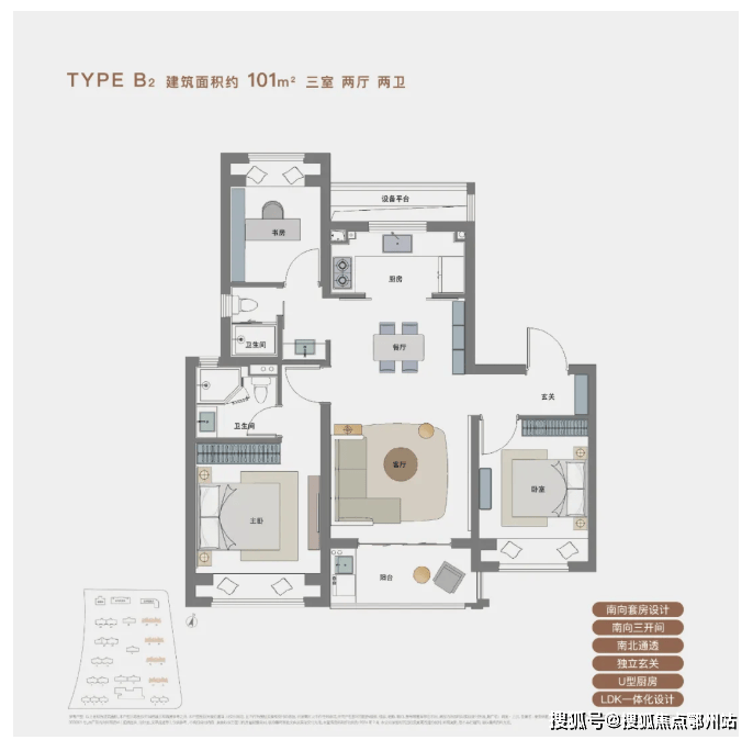 建面约101㎡三室两厅两卫:5.2米面宽横厅设计,LDK一体化布局,空间通透感极强。连接大尺度观景阳台,采光通风俱佳;主卧大套房带飘窗,尊崇感十足,可满足三口之家的多元生活需求;