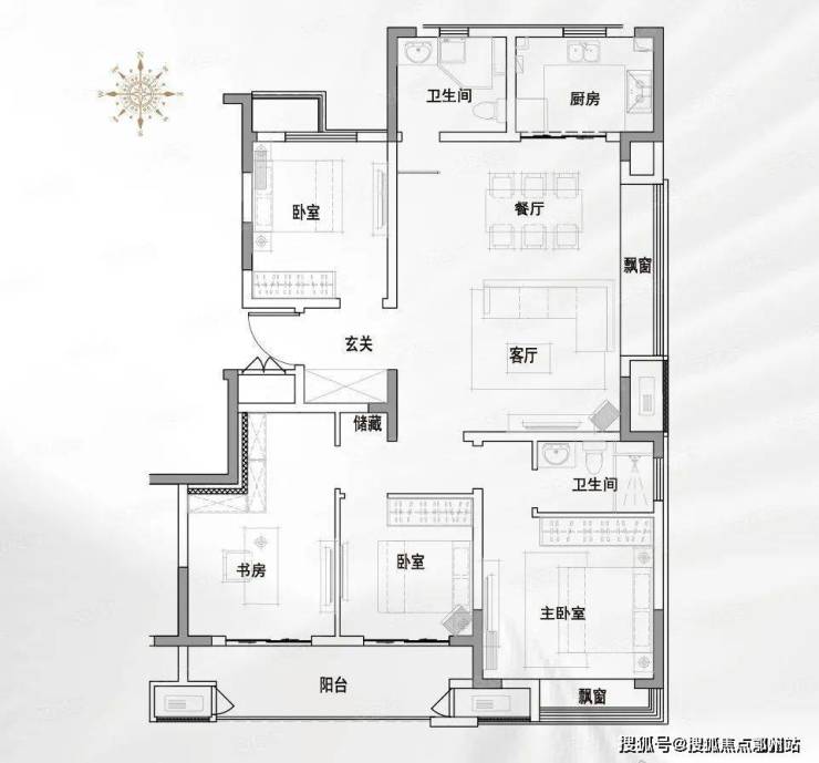 123㎡ 户型中客厅面宽达到3.8米大面宽,客餐厅位置相连可以达到更好的采光通风效果,主卧室的 开间达3.4米,