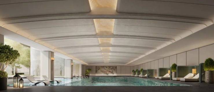 在这里,你能拥有什么?一座约标准泳道的恒温泳池,配备泡池与漂浮躺椅,通过大面积玻璃引入天光,游弋其间如同置身度假酒店的无边水境。