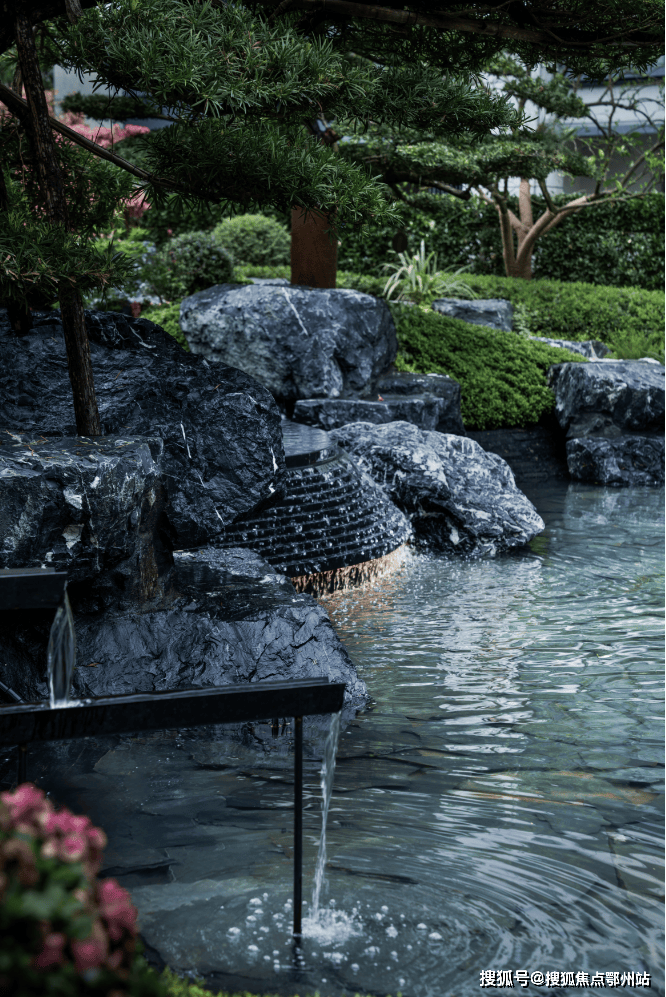 叠水如溪,潺潺而下,古松苍劲,延枝迎宾,一幅淡雅悠然的山水之画跃然眼前,让人心生向往之情。