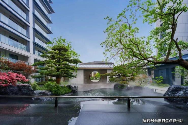 两侧的罗汉松枝干伸展,邀远方之客前来赏景, 松风水境相映,让人在绿意的间隙中放缓心境,成为尊贵的第一道归家礼序。