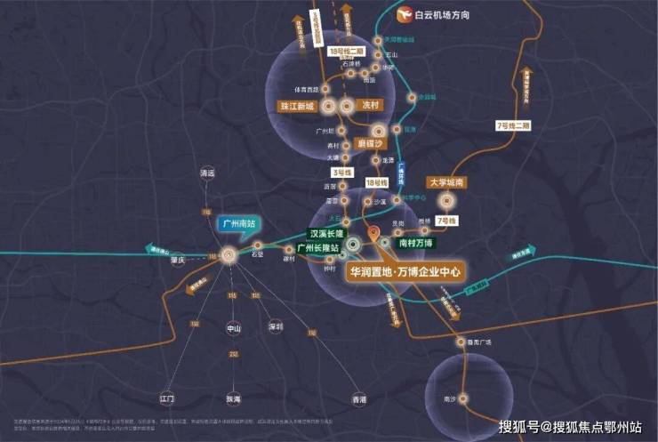 项目踞守“黄金两公里”城市金脊,无缝衔接长隆世界级文旅IP与万博商务核芯,帷幄广州交通枢纽,约1小时联动大湾区主要城市。地铁3/7/18号线在此交织,两站直达珠江新城,为企业铺设一张贯通湾区、接轨全球的效率路网。