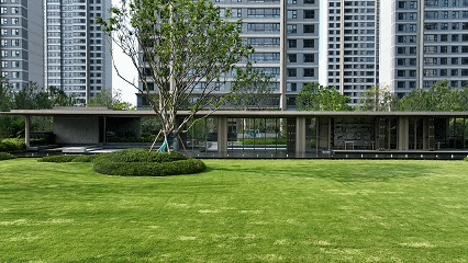 开阔浪漫的草坪空间更是 拍婚纱照和草坪婚礼的绝佳场地,业主可以在家楼下记录最甜蜜的时刻;草坪两侧设置两 排发呆亭,业主们在这里发呆闲聊,在自然中晾晒身心,自然就放松下来。