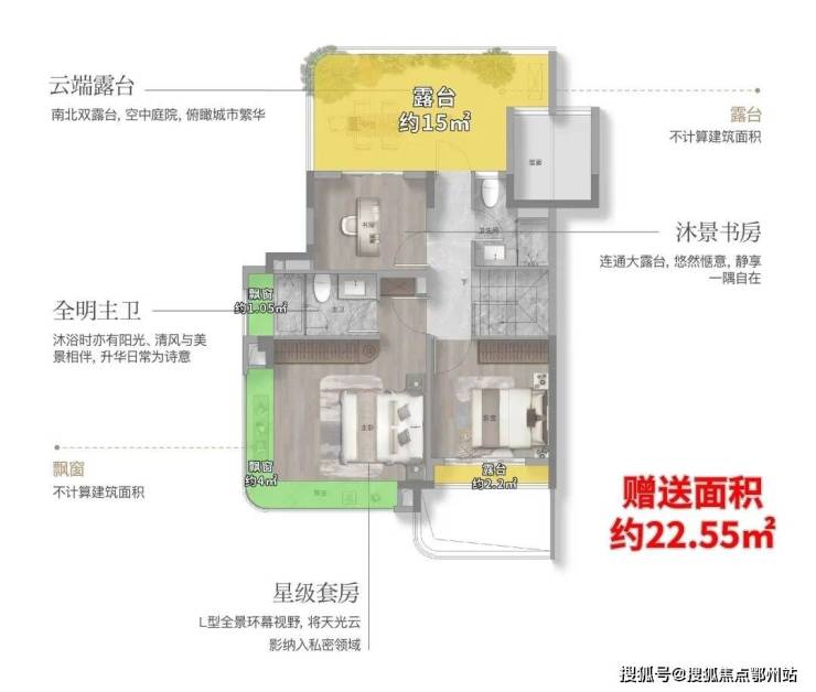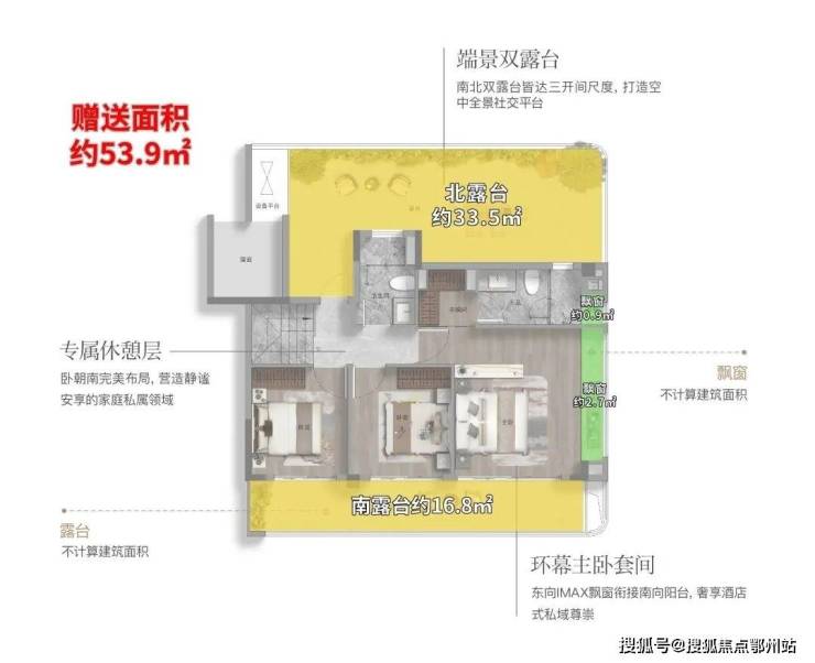 建面约144㎡的上叠产品,通过巧妙的 挑 空、 总计约 15㎡露台 及灵动空间设计,让户型的 实际可使用面积高达约180 ㎡,实得率约125%。