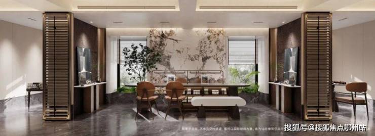 精致的迎宾水景、苍劲滴翠的罗汉松,为城市的界面,增添一抹亮色,也让当代年轻人,在享受现代都市生活的同时,感受到家的温暖和亲切。蓝翡翠的奢石,以深邃幽远的尊蓝色基底,尽显光彩下的神秘奢华;而顶部异形的仿铜星空顶设计,用香槟金色斜角造型铝板搭配熠熠灯光,碰撞出科技与艺术的美学。