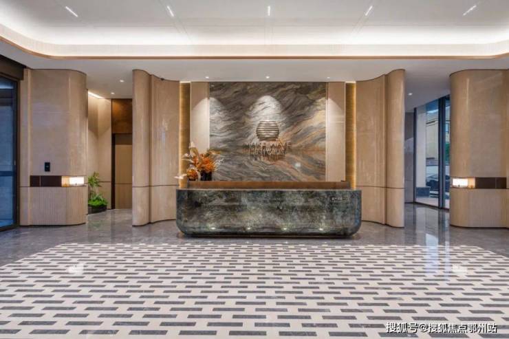 蓝翡翠异形接待台,立于海纳百川七彩奢石背景墙前,历久弥新的奢石传递不朽价值,以自然鬼斧造就的独特纹理及富有韵味的通透质感,见证光与美的相得益彰;地面闪电米黄和布鲁诺灰的石材拼花,优雅浪漫,是对潮尚生活的引领,也是一次对美与秩序的坚持。